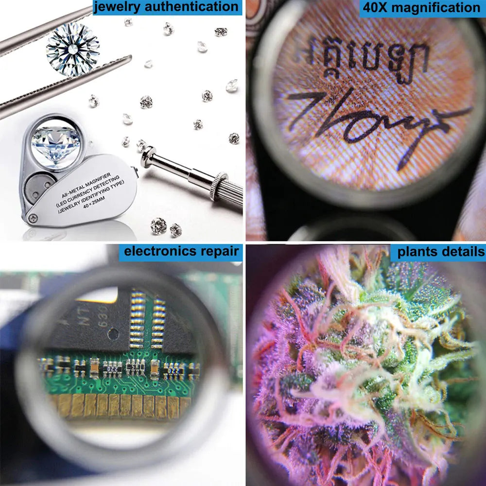 Loupe de bijoutier pliante de poche 40X, monture métallique avec éclairage LED et UV.